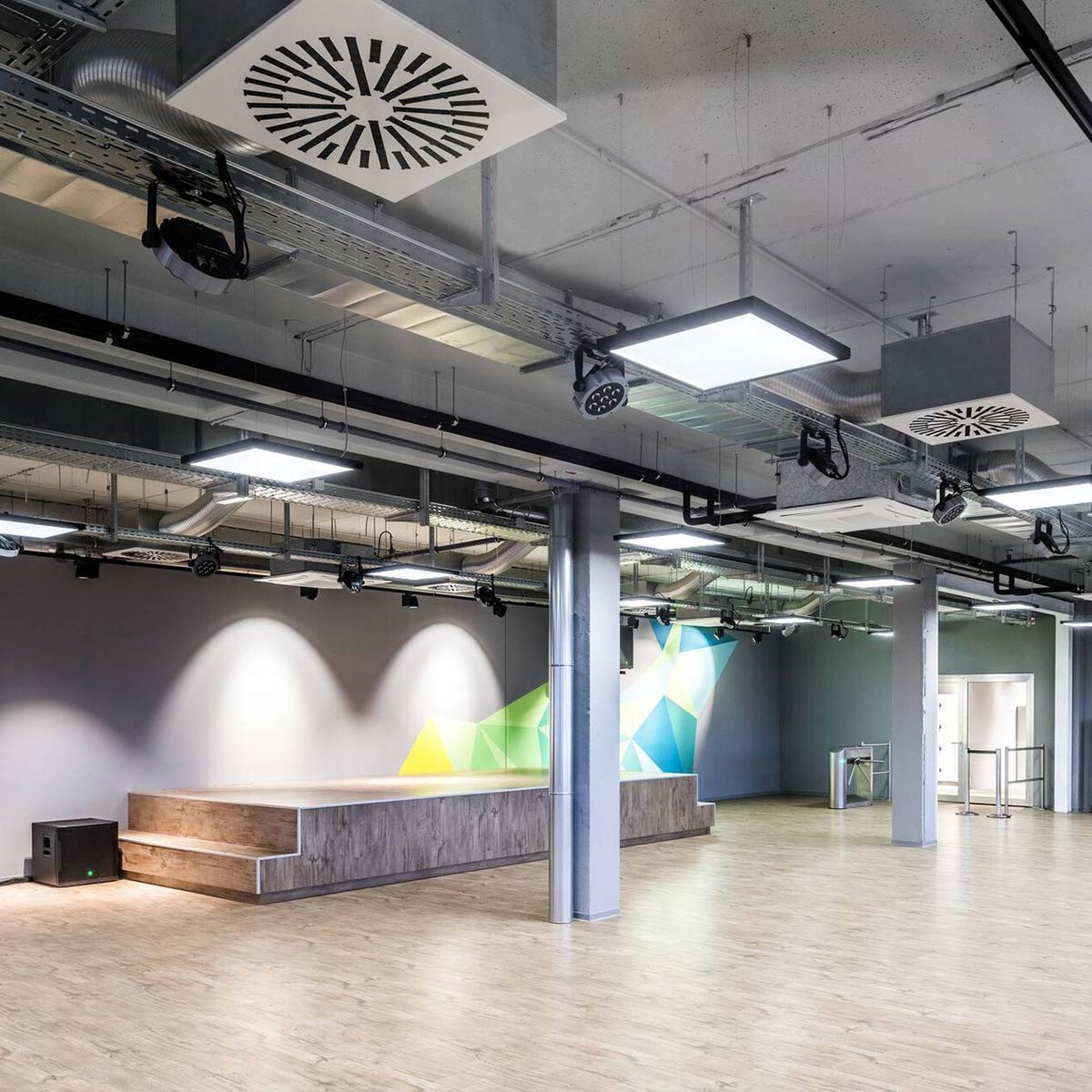 Verausgabung bei Zumba oder Spinning, Entspannung beim Yoga: Kursräume im Studio passen sich ganz unterschiedlichen Konzepten an, optimal unterstützt durch variables Licht und komfortable Steuerung