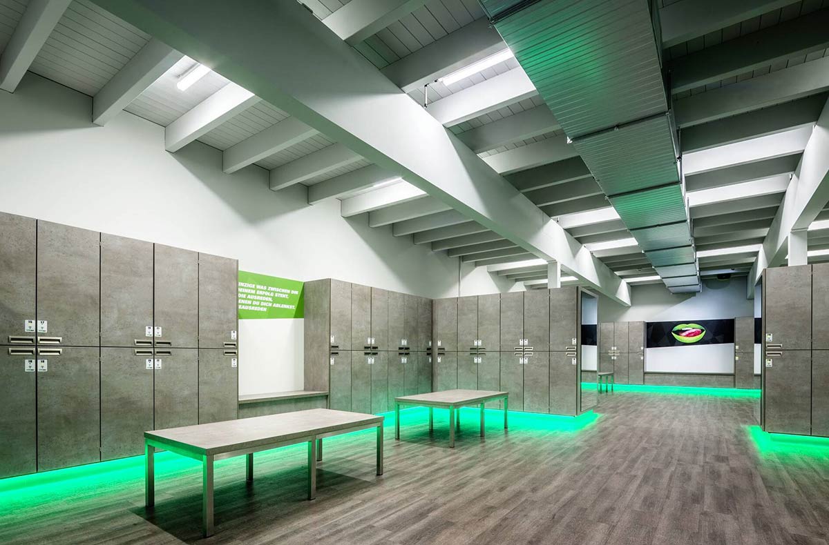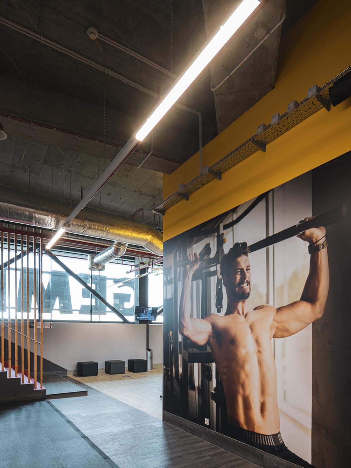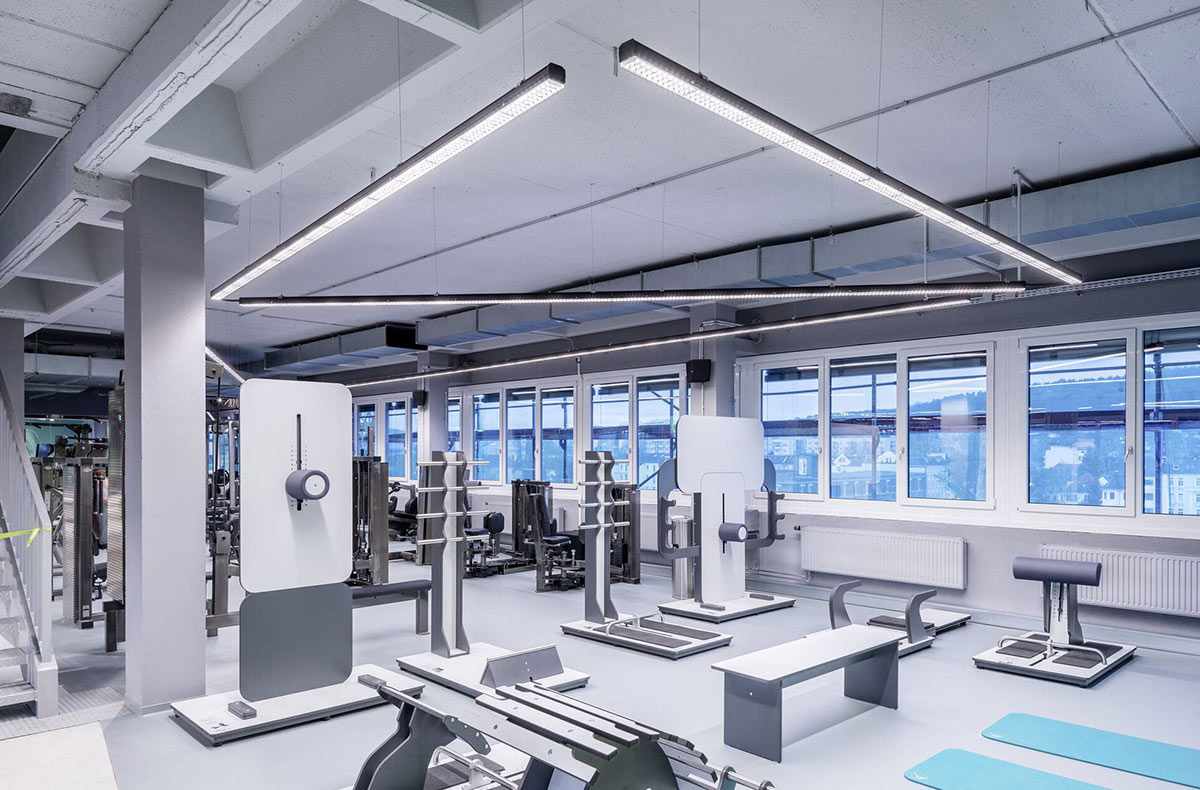 Hier werden an Trainingsgeräten Körper geformt. Licht unterstützt den Charakter der Architektur, unterstreicht die Dynamik im Raum und gewährleistet ein sicheres, effektives Workout.