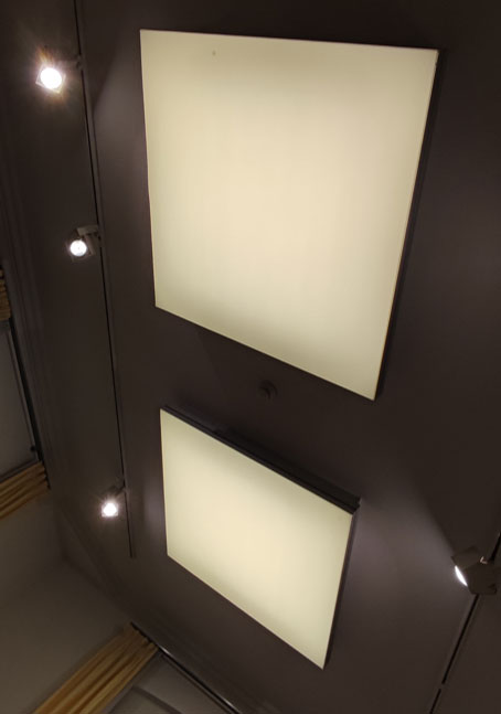 Zur Sanierungsaufgabe gehörte die Ertüchtigung von diffus abstrahlenden Lichtdecken, in die anstelle der bisherigen T5-Leuchtstofflampen entsprechende LED-Leuchtmittel eingesetzt werden sollten. Insgesamt 54 Elemente sind nun in den sechs verschiedenen Paneelen mit jeweils 1,4 x 1 Metern bzw. 1,4 x 1,4 Metern Fläche verbaut. Neben den in der eigenen Manufaktur gefertigten Sanierungseinsätzen konnte TRILUX zum Projekt auch sondergefertigte Wandanbauleuchten sowie Komponenten für das Lichtmanagementsystem beisteuern.