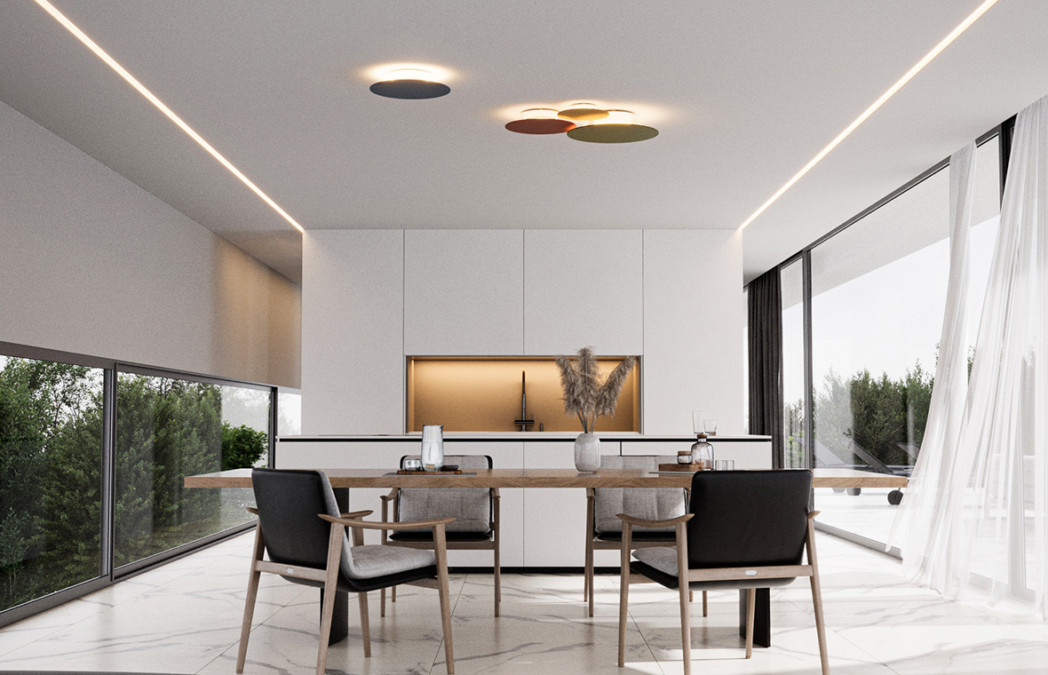 The Oniq is a versatile element for designing ceilings and walls with light and form. The lights with their circular cover in two sizes and three colours can be arranged in a simple and playful way.