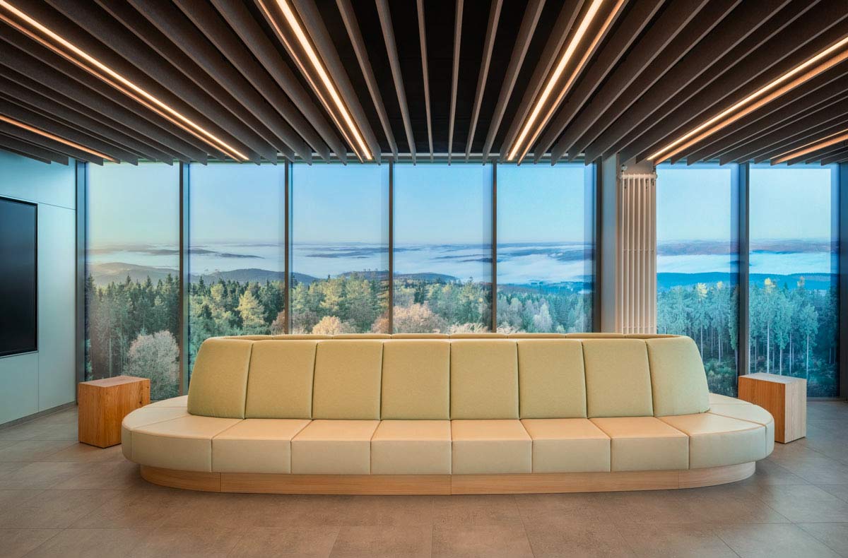 Finea directs the eye and supports the flow of movement in a building. This creates visual guidance that connects transit zones and relaxation areas.