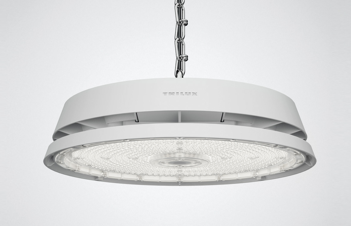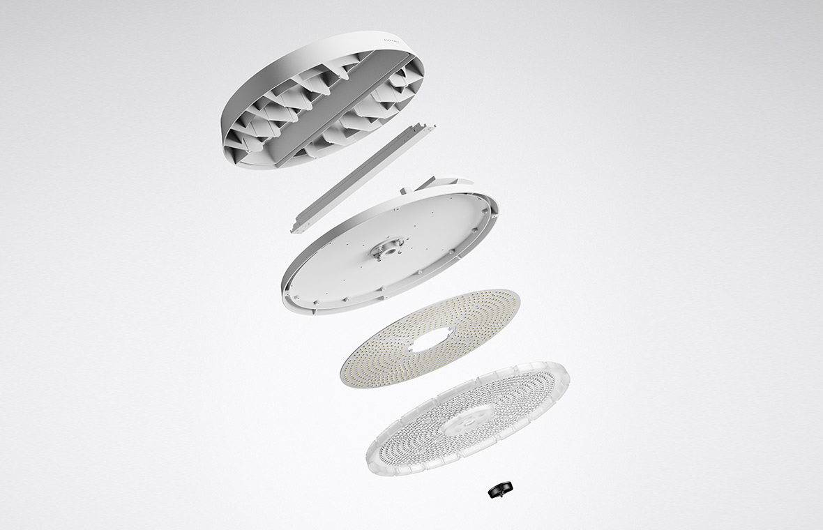 Typical Mirona Fit family, but in a round design: the Mirona Fit R highbay luminaire is particularly good for refurbishment projects thanks to its wide range of variants and single-point suspension. A smart feature: an optional Zhaga interface allows sensors and light management to be integrated.