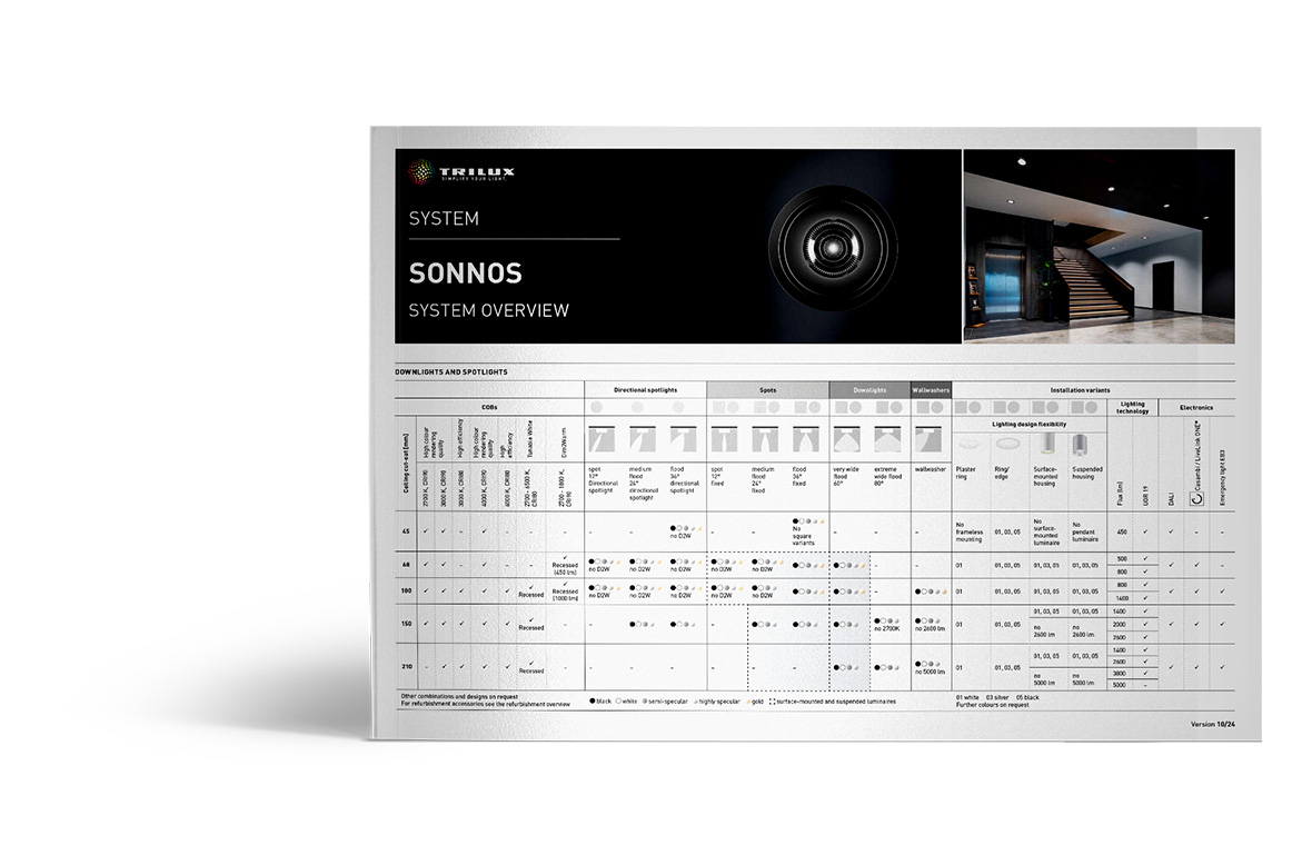 Downlights, directional spotlights, spotlights, pendant luminaires and wallwashers: Sonnos offers high quality light for projects in offices and public buildings.