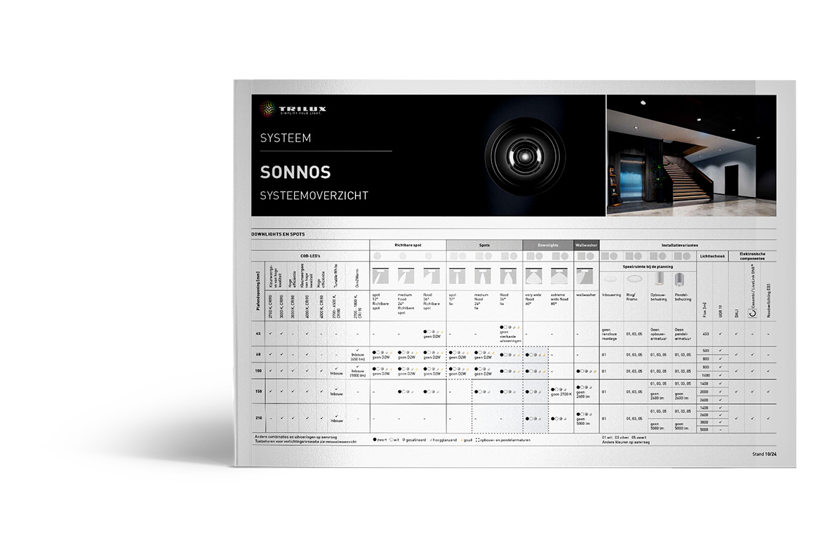 Inbouw, opbouw of pendelend – de configurator heeft geen moeite met de vele uitvoeringen van de Sonnos LED. Een paar keer klikken volstaat om alle gegevens aan te maken voor de verdere planning. Kunt u uw eisen niet realiseren met de configurator? Geen probleem! Wij adviseren u graag voor uw individuele, projectspecifieke oplossingen!