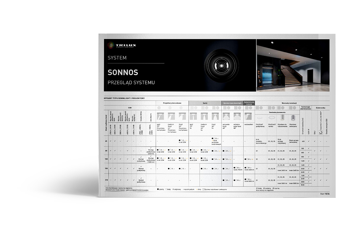 Maksymalna wszechstronnośćOkrągłe albo kwadratowe, poziome albo pionowe, projektory punktowe o wąskim rozsyle światła albo wydajne oprawy ścienne – oprawy Sonnos LED dostępne są w pięć rozmiarach do otworów sufitowych od 45 do 210 mm. Wzornictwo, materiały i technologia oświetleniowa poszczególnych wersji są jednolite. Wszystkie warianty można doskonale łączyć w jednym projekcie.